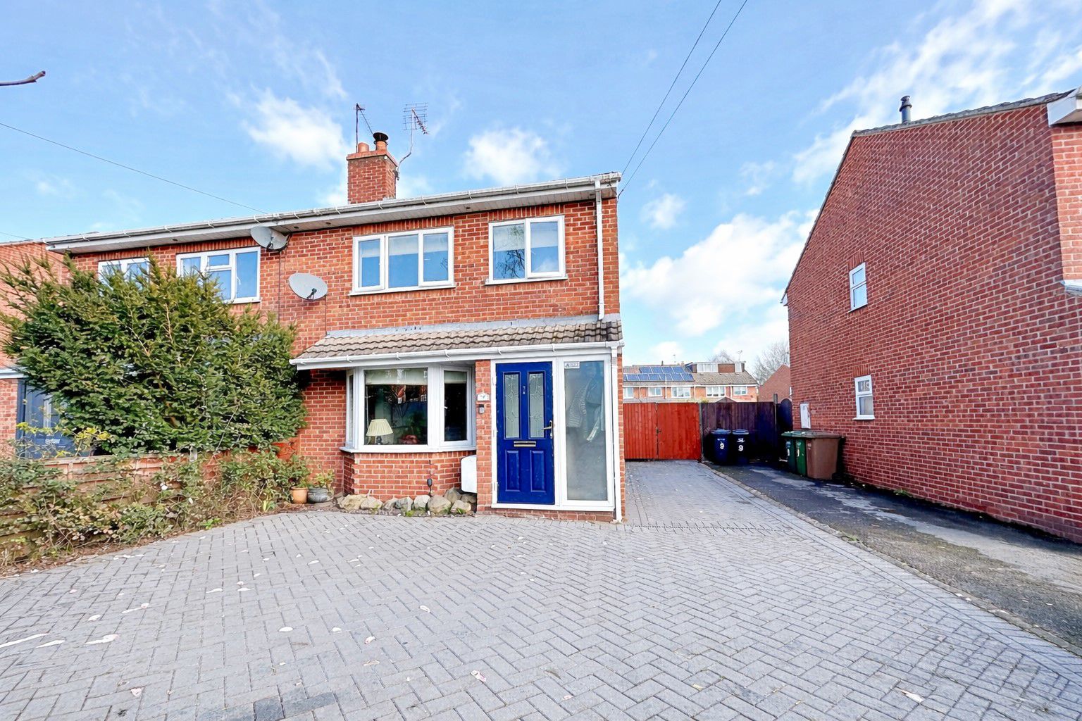Blocked paved driveway for multiple vehicles; mature planted borders; gated access to the rear garden.