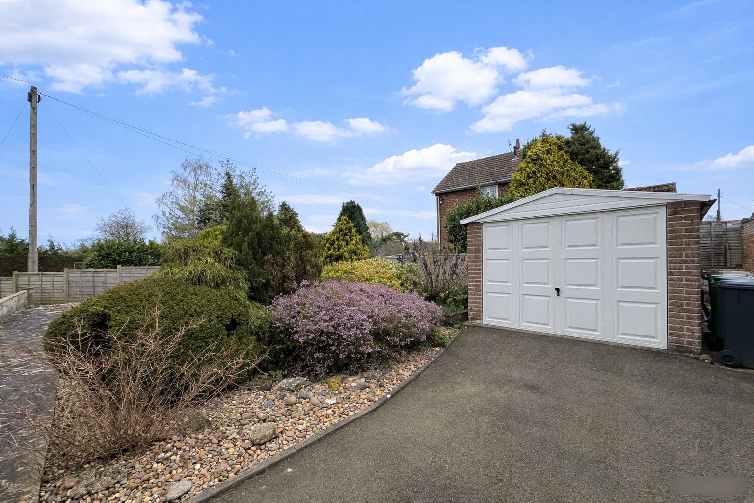 Generously laid to lawn; gravel and patio zoned areas. Mature planting; gated side access. Driveway with parking for several vehicles and pebbled front feature. Garage; wall light; tap.