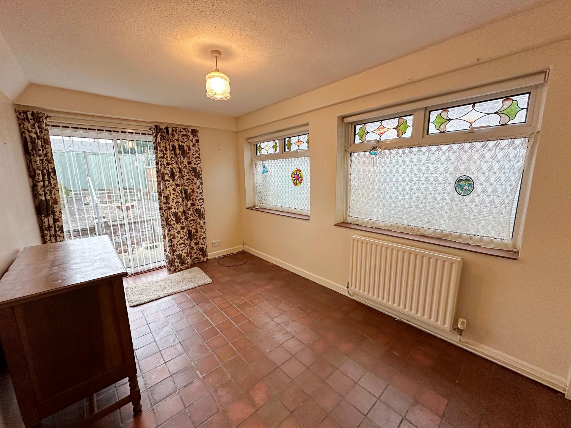 Dual aspect obscure glazed windows to the side with stained glass features. Sliding doors into the rear garden; pendant light fitting; radiator; tiled flooring.