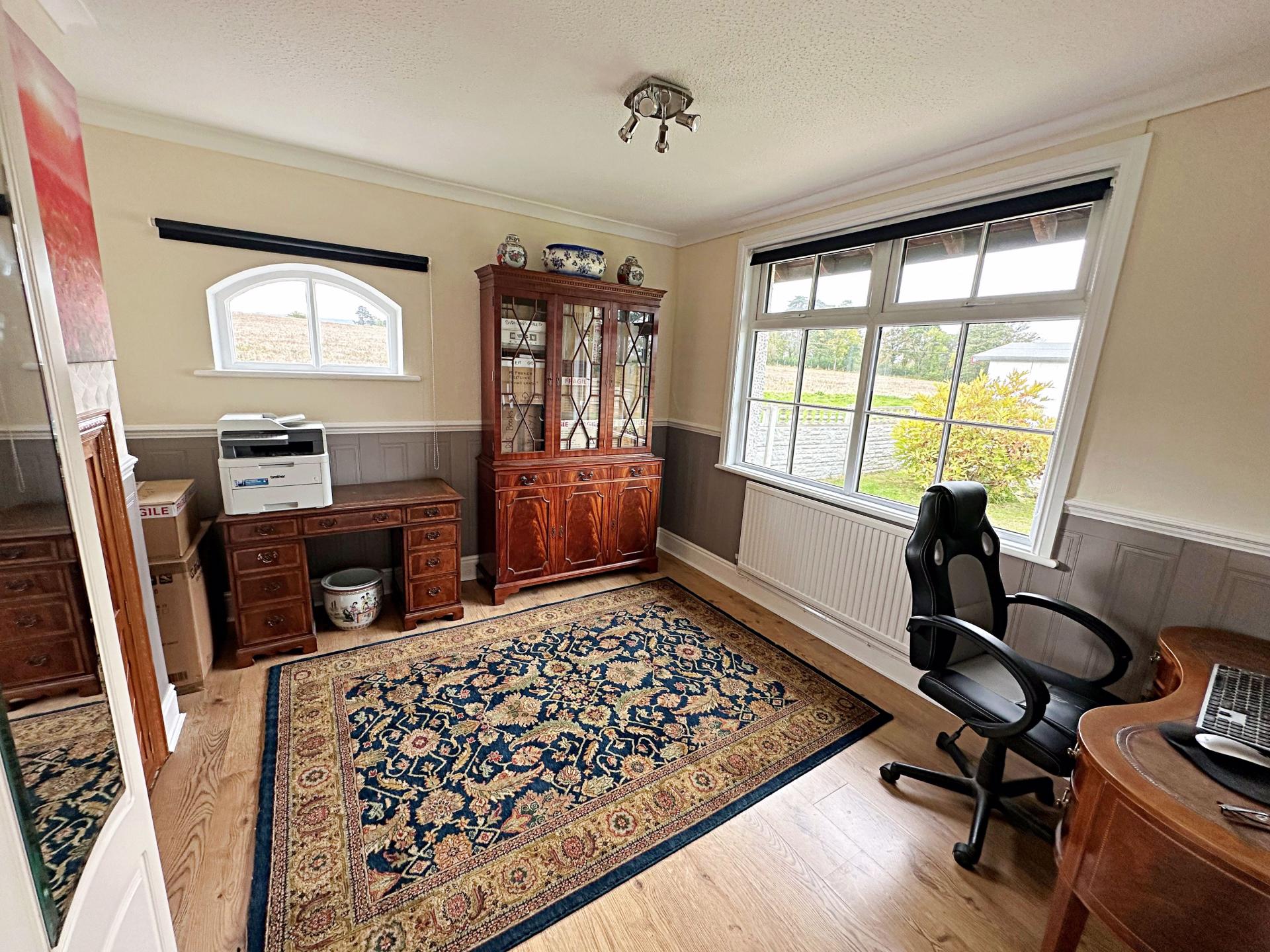 Currently used as an office. Double glazed window to the front aspect and feature arch window to the rear. Fitted storage cupboard. Dado rail. Laminate wood flooring. Radiator.