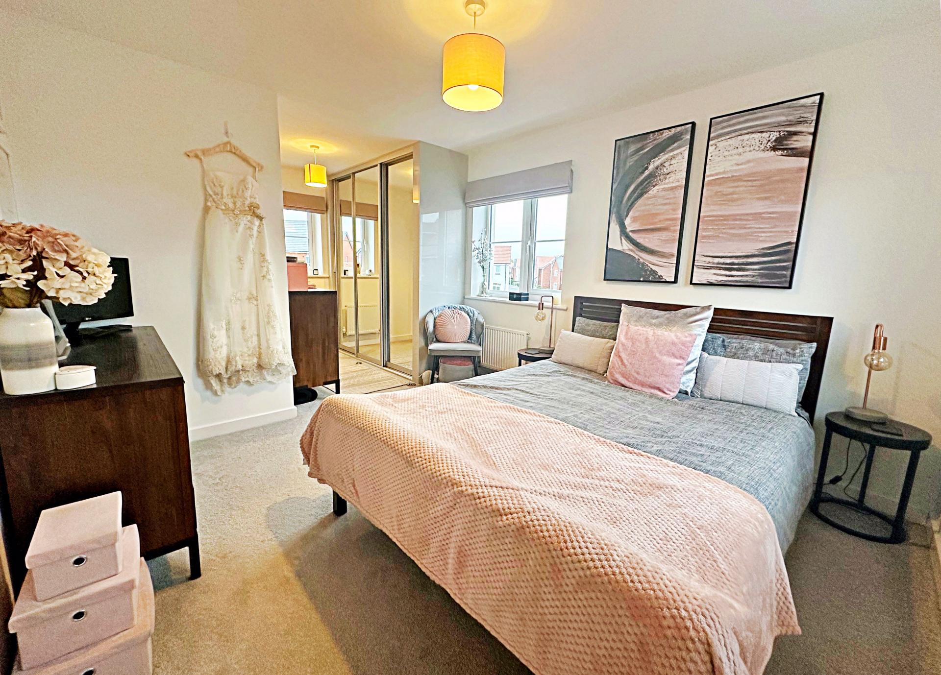 Double glazed windows to the front, side and rear aspects with internal blinds. Built in wardrobes with mirrored sliding doors. Pendant light fitting. Radiator. Door into the en-suite.