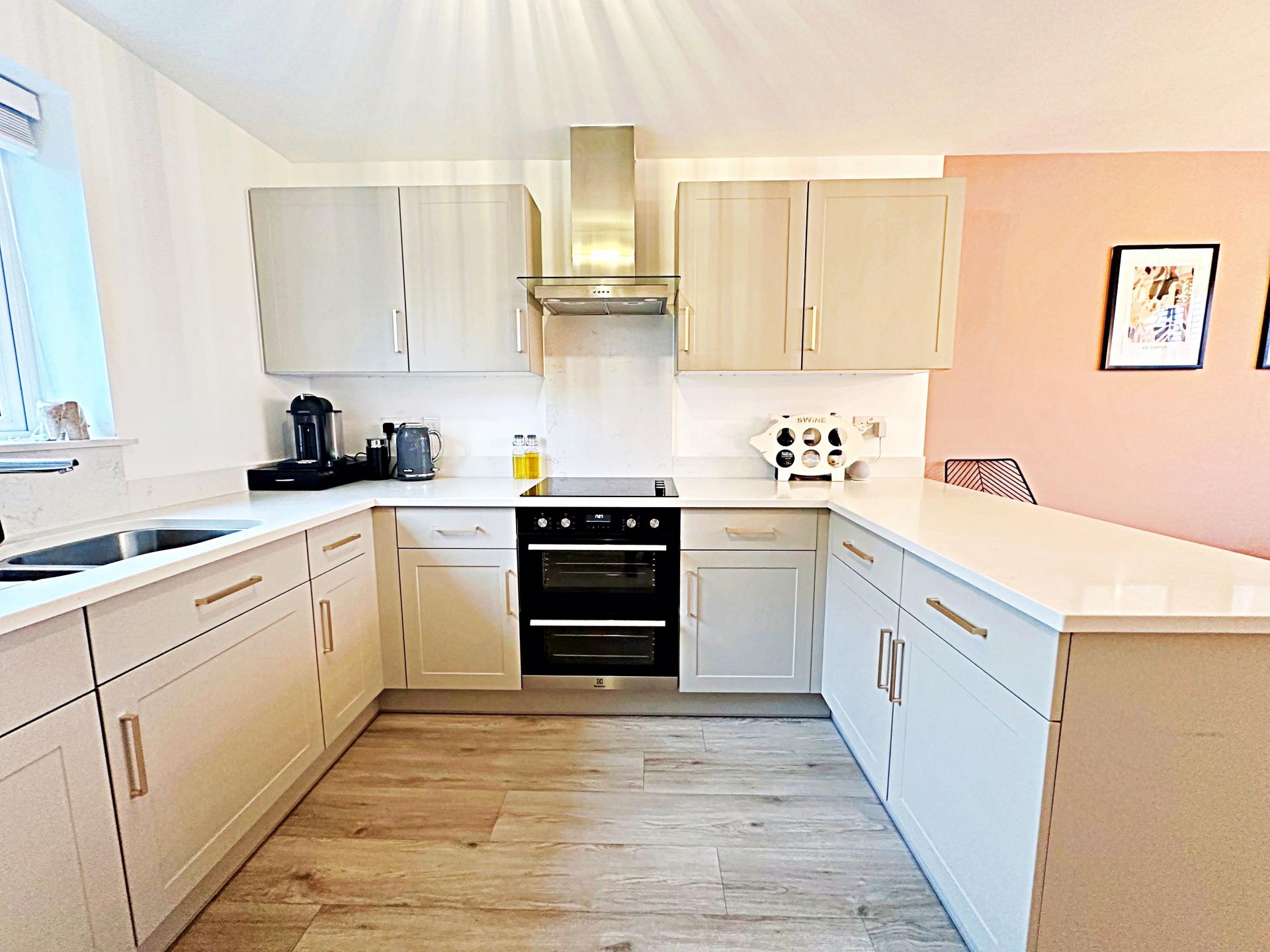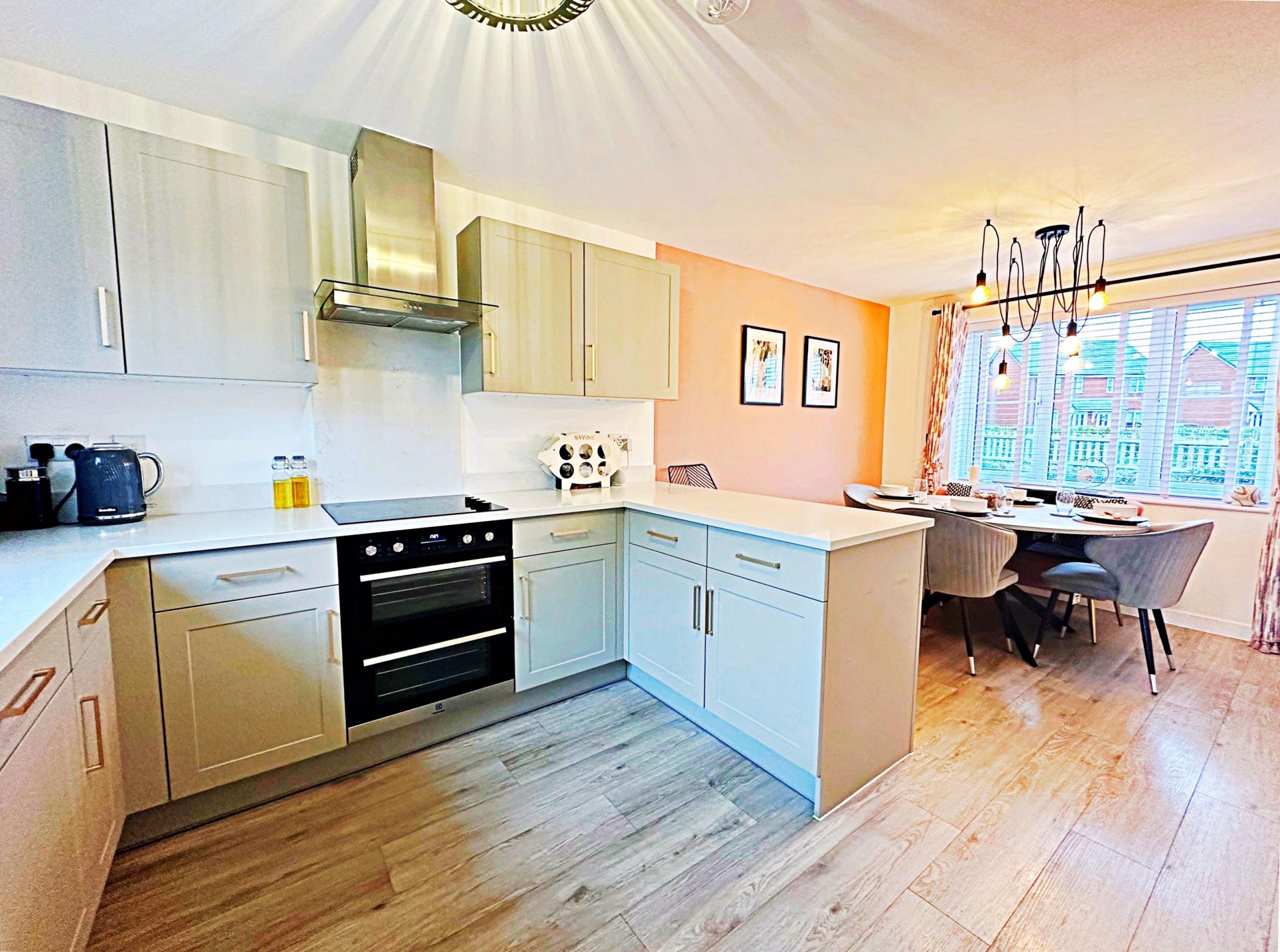 Double glazed windows with internal blinds to the front and rear aspects. Range of wall and base units surmounted with quartz work surface and breakfast bar. Stainless steel one and a half sink with mixer tap. Integrated electric oven, induction hob and extractor fan above. Integrated 'Zanussi' dishwasher and fridge/ freezer. Pendant light fitting. Radiator; Doors into the utility room and storage cupboard.