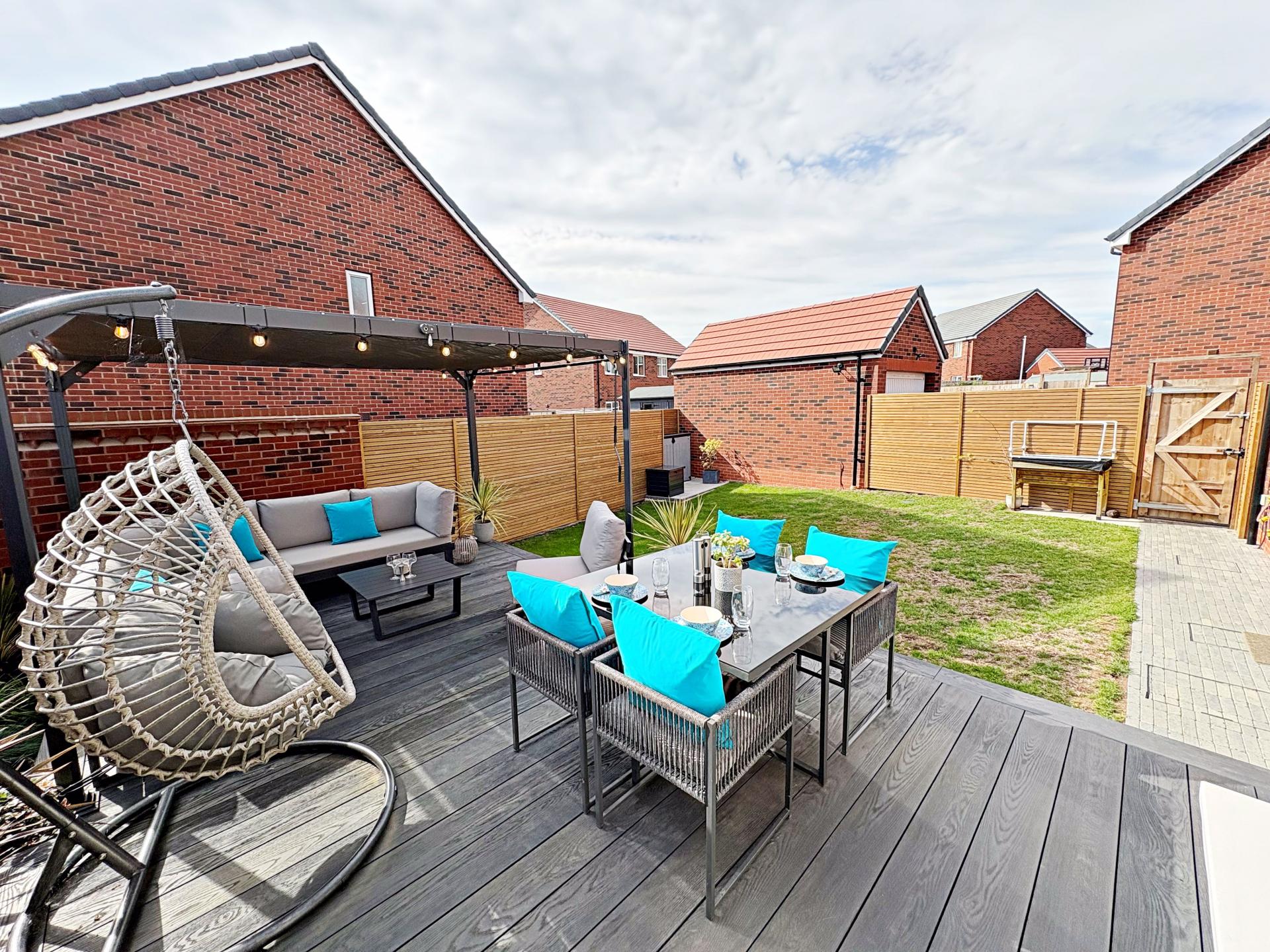 Part walled garden which is laid to lawn with raised wooden decking seating area. Hard landscaped area for a storage shed. Path to the side gate leading to the driveway and garage.