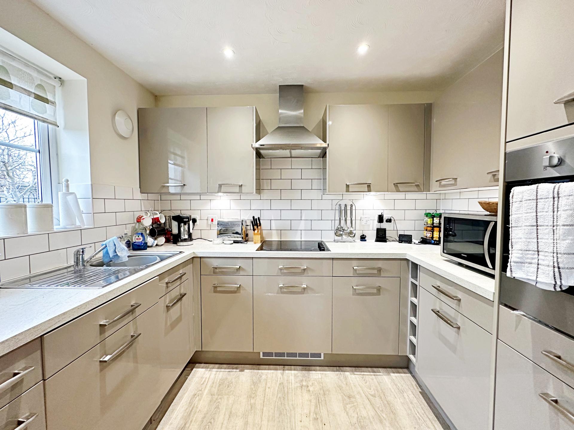 Double glazed window to the side aspect. A range of wall and base units surmounted by worktop and under counter down lights; stainless steel sink and drainer with mixer tap; tiled splashback. Integrated 'Zanussi' electric hob and extractor over; eye-level 'Zanussi' electric oven; under counter fridge, freezer and washing machine. Down lights; extractor.