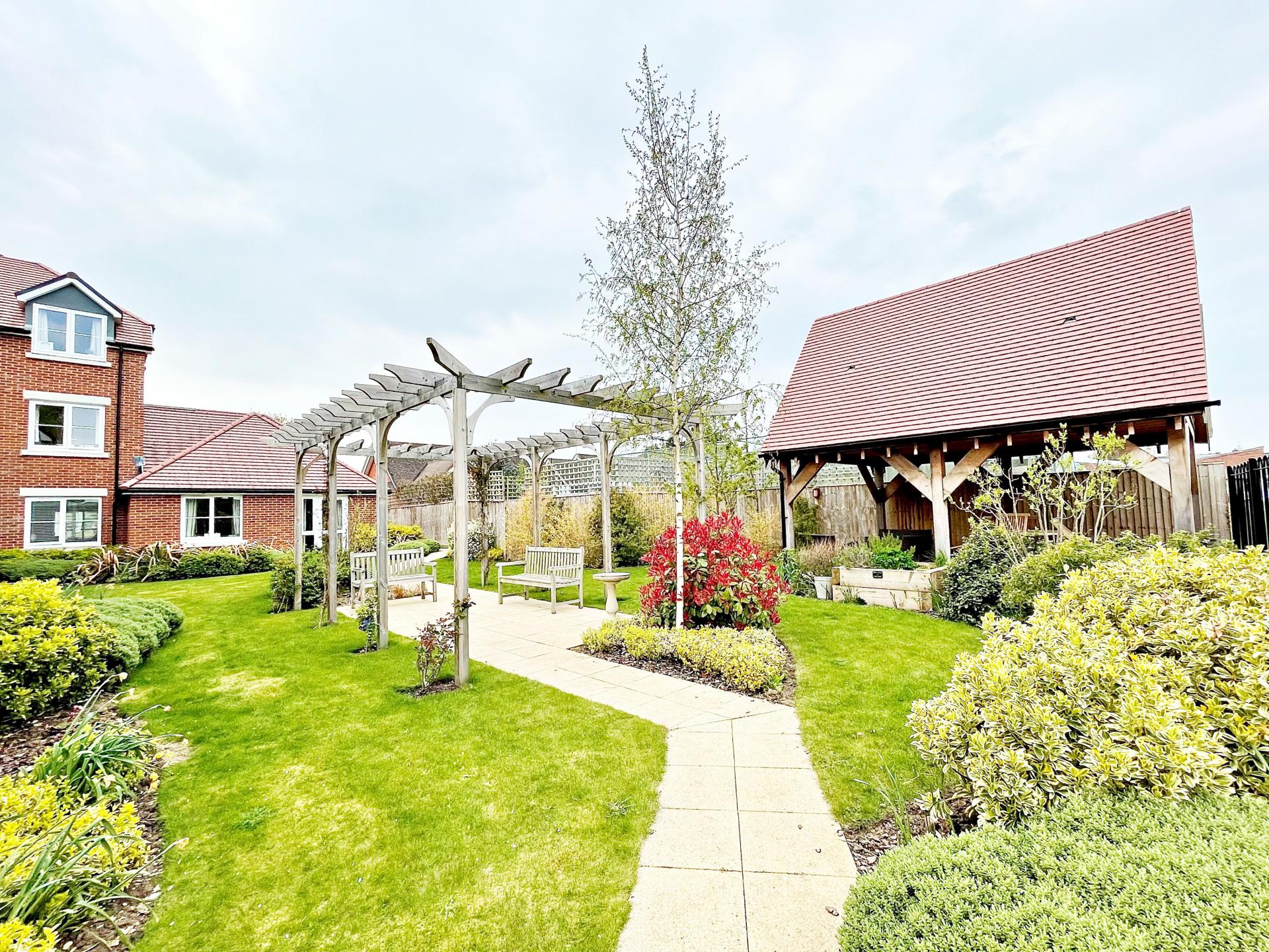 Well stocked communal garden with wooden gazebo seating area.