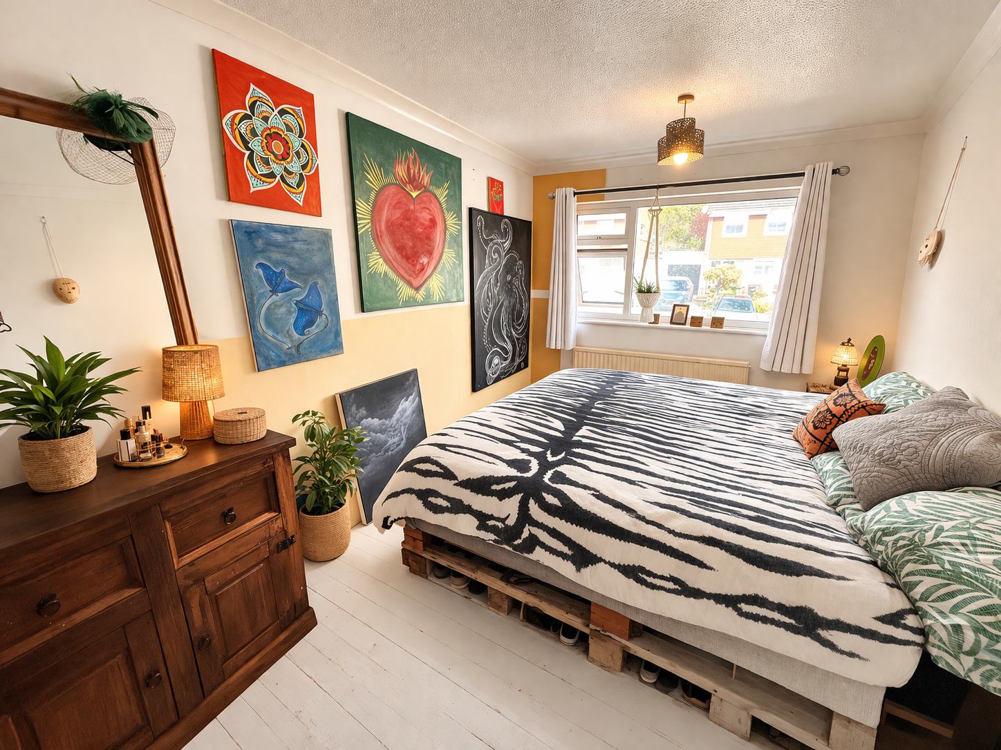 Double glazed window to the rear aspect. Far reaching views to Bredon hill. Pendant light fitting; coving; radiator. Doors to the landing and built in storage.