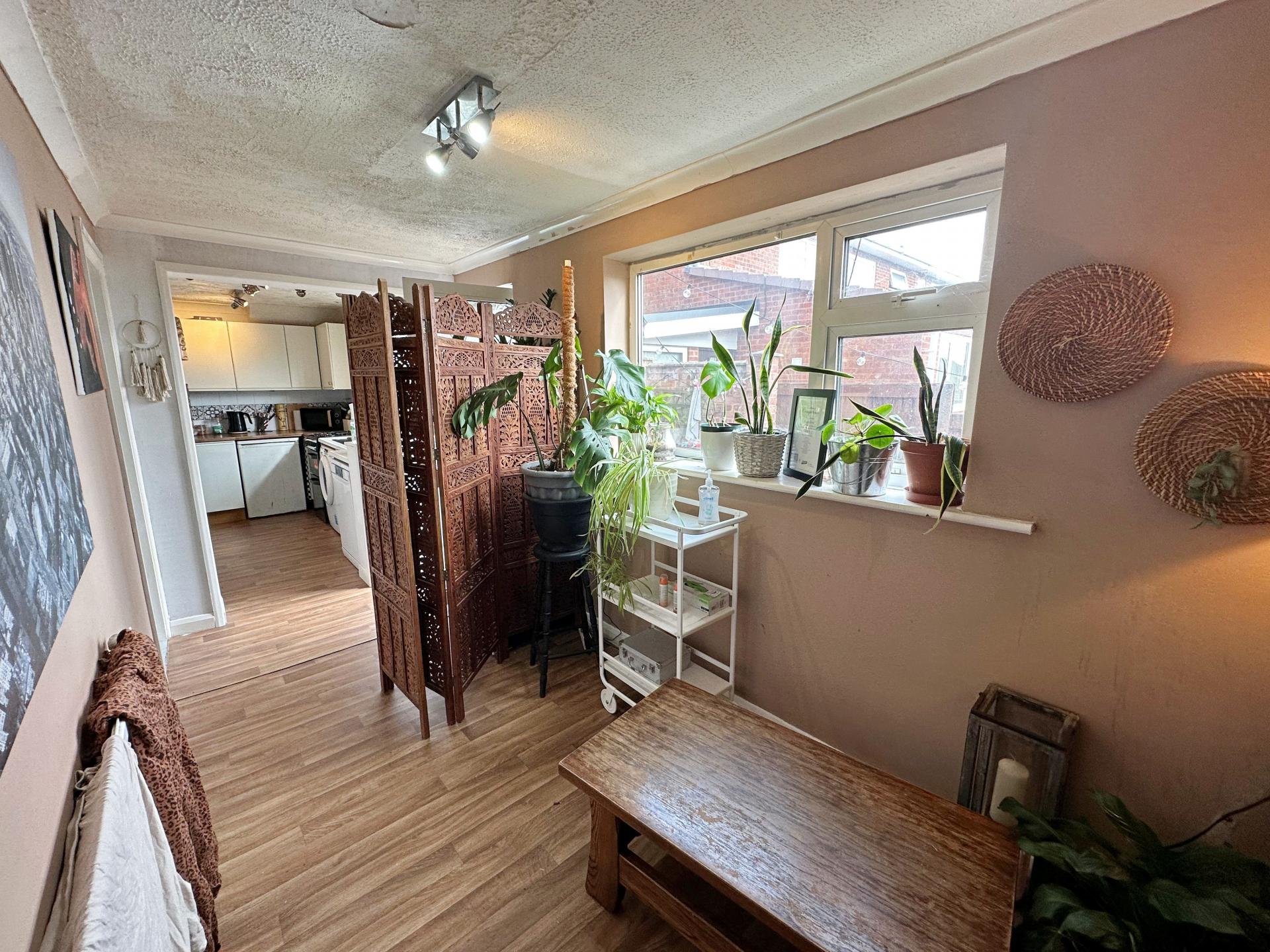 Double glazed windows to the side aspect. Range of wall and base units surmounted with laminate worktop; space and plumbing for dishwasher; washing machine and oven. Stainless steel sink and drainer with single lever mixer tap; part tiled walls. Spot light fittings; coving; radiator; linoleum flooring. Open plan into the Kitchen and the Snug.