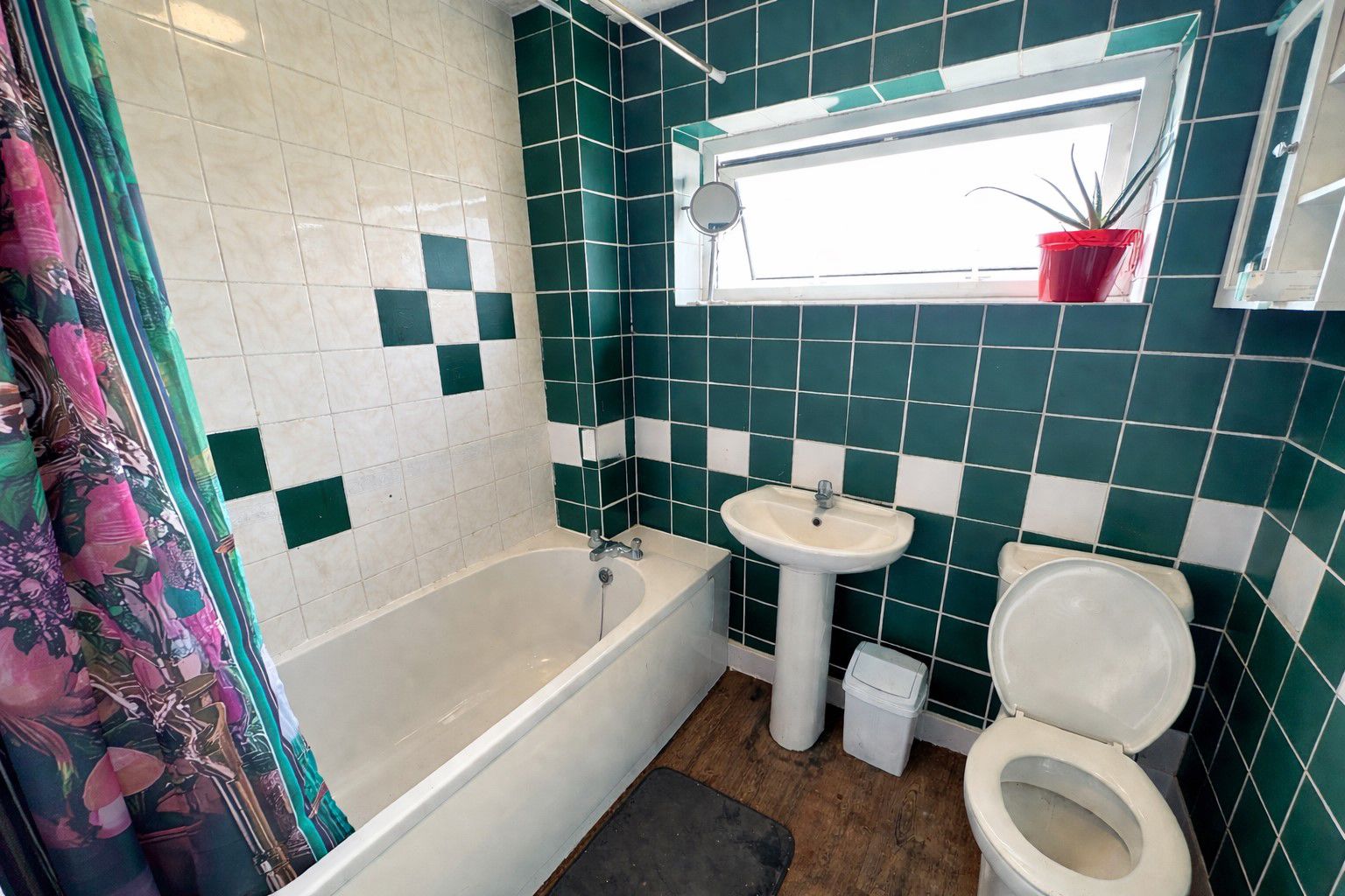 Obscure glazed window to the rear aspect. Hand wash basin with single lever mixer tap; alcove bath tub with electric over head shower and mixer taps; low level w.c.; radiator. Tiled walls; linoleum flooring. Door leading to the landing.