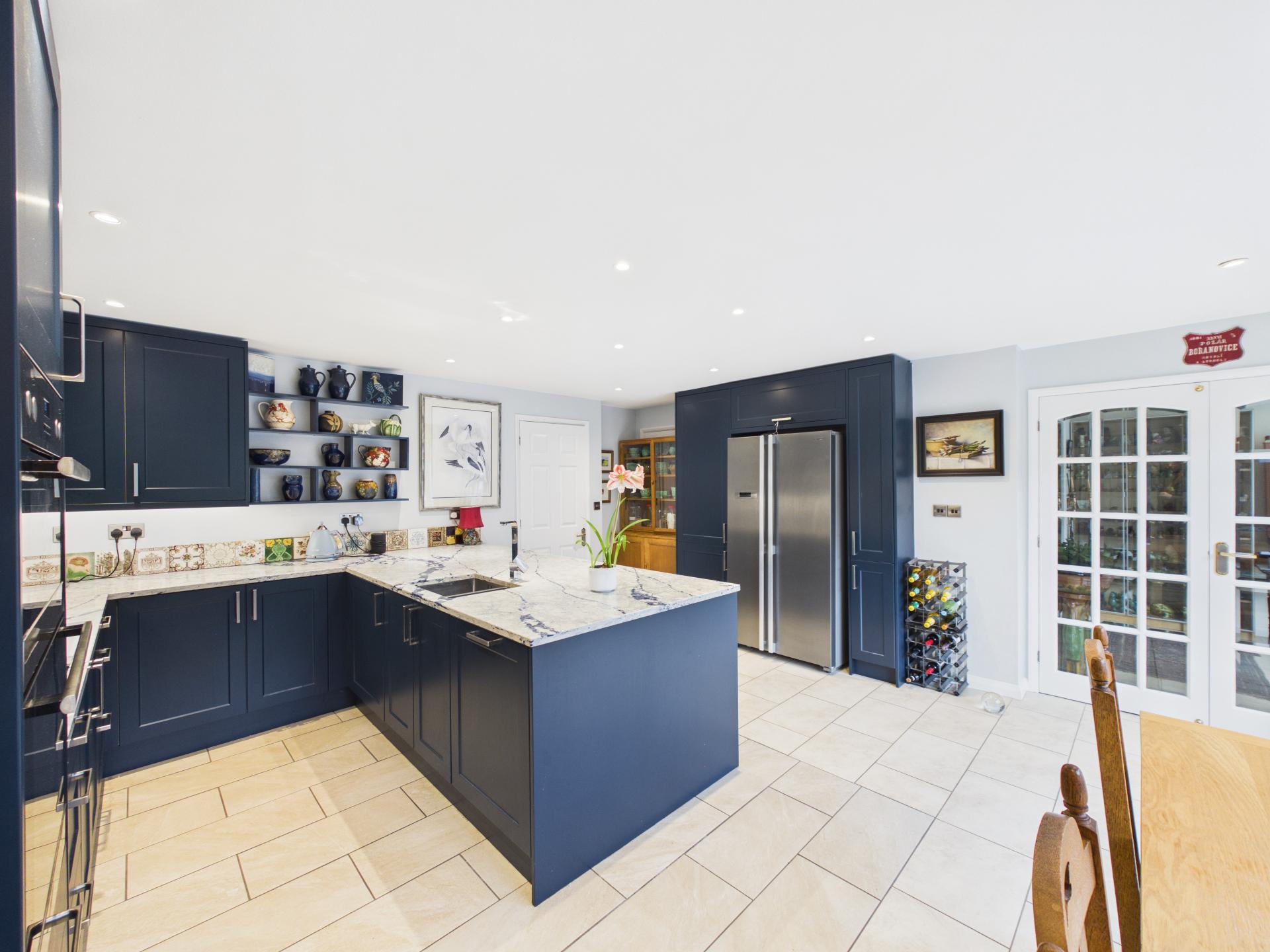 Double glazed windows tot he rear aspect with French doors leading to the garden. Down lighting with integrated LED strip lights. A range of wall and base units surmounted with marbled effect worktop; tiled splash back; one and a half steel sink with single lever mixer tap. Integrated 'AEG' electric grill and fan oven; 'AEG' venting induction hob. Integrated 'Bosch' dishwasher; integrated units with space for a fridge/freezer. Tiled flooring; doors leading to the garden room; utility room and entrance hall.