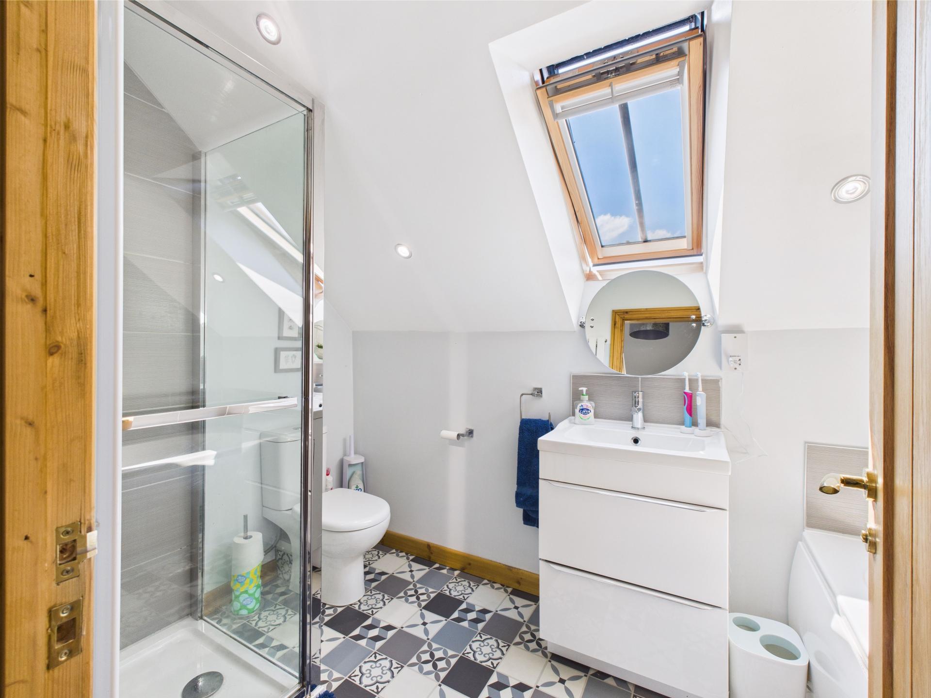 Velux roof light to the rear aspect. Panelled bath. Tiled shower cubicle with electric shower. Vanity wash hand basin with mixer tap. Low level w.c. Contemporary vertical radiator. Ceiling down lights.