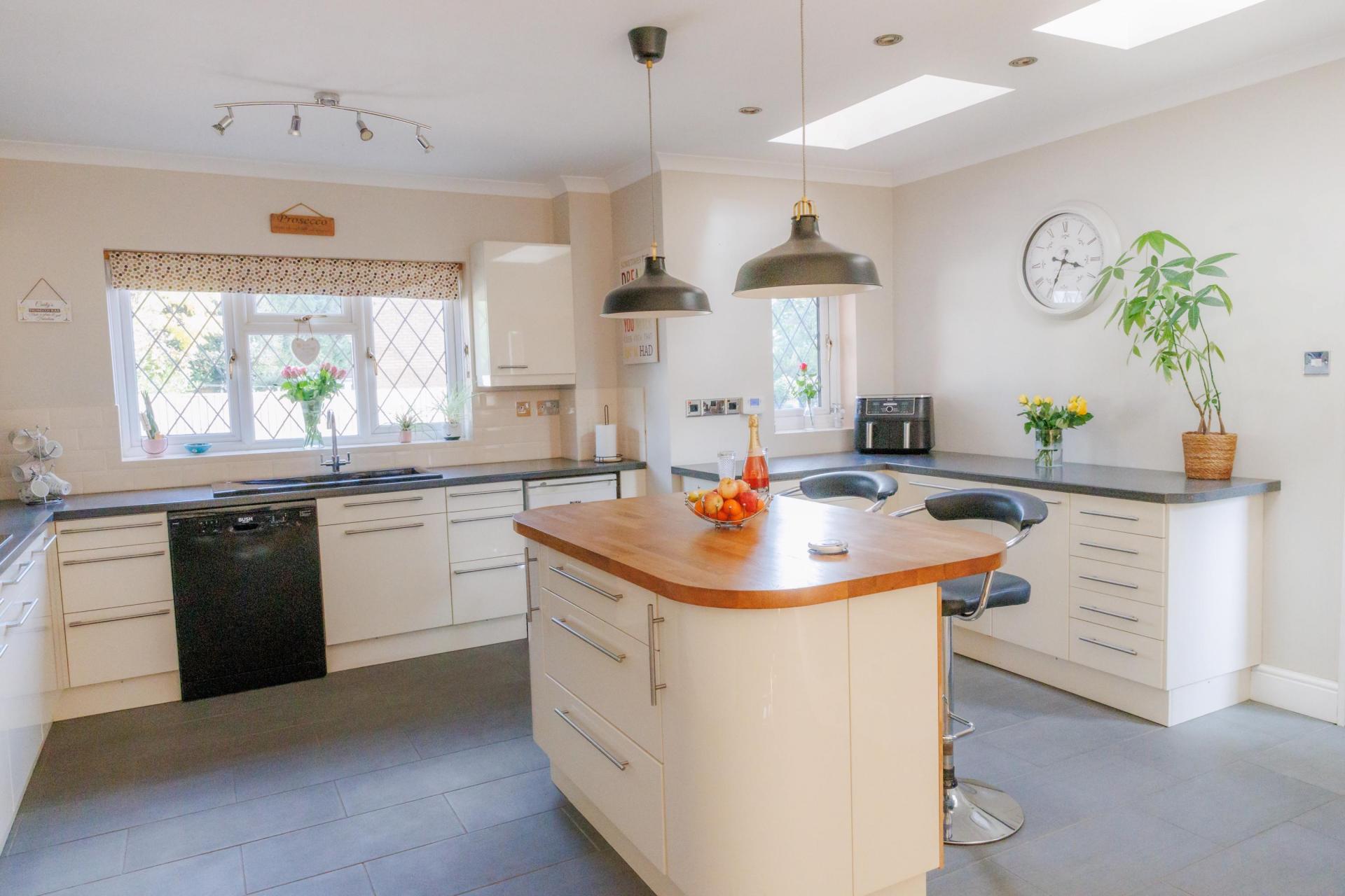 Double glazed windows to the side and rear aspect, double glazed 'Velux' above. A range of wall and base units surmounted by worksurface with integrated oven, hob and extractor above; sink and drainer with tiled splashback. Island and breakfast bar with base units surmounted by wooden worksurface with electric points. Space and plumbing for appliances. Tiled flooring. Contemporary radiator. Door to the utility room.