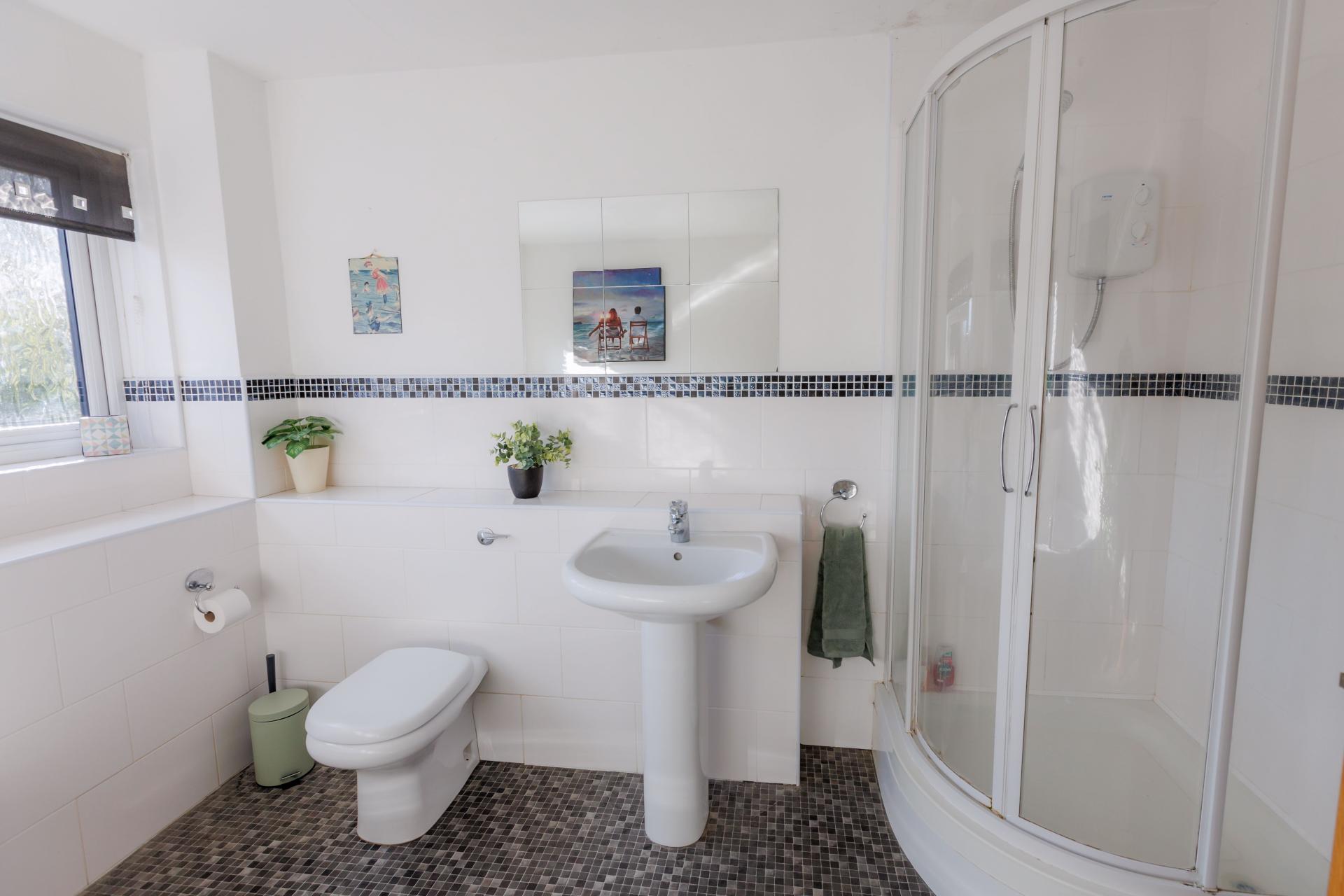 Obscure double glazed window to the rear aspect. Corner bath with mixer tap; corner shower with mains fed 'Triton' electric shower, glass sliding doors; pedestal wash hand basin and low flush w.c. Down lights; radiator; part tiled walls and flooring.