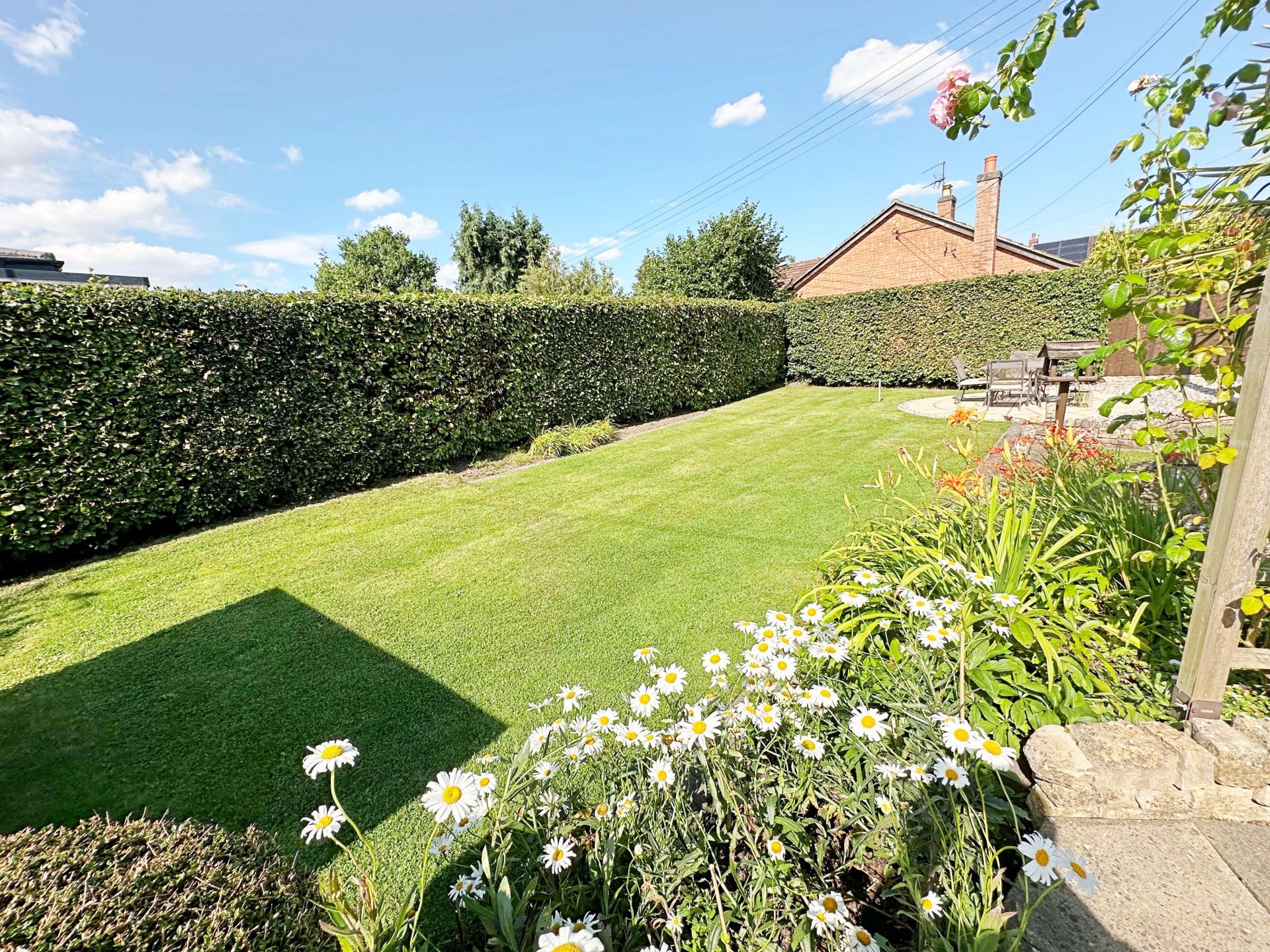 Laid to lawn with patio seating areas and an abundance of planting. Outside water tap. Views to the church. Access to the garage and gated access to the front of the property. Worcester oil fired boiler. Oil tank.