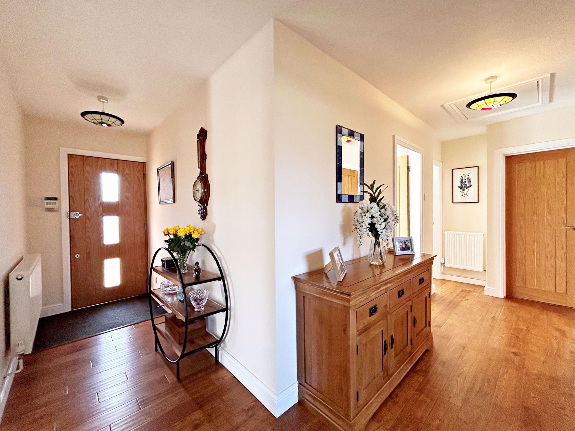 Doors to the living room, kitchen/dining room, utility room, shower room, storage cupboard and three bedrooms. Access to the loft (part boarded with light and ladder). Engineered oak flooring. Two radiators.